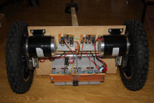 Ansicht von unten. Motoren, H-Brücken und Akkus.Habe gestern eine doppelseitige Platine für Atmega32 fertig entworfen (Eagle),